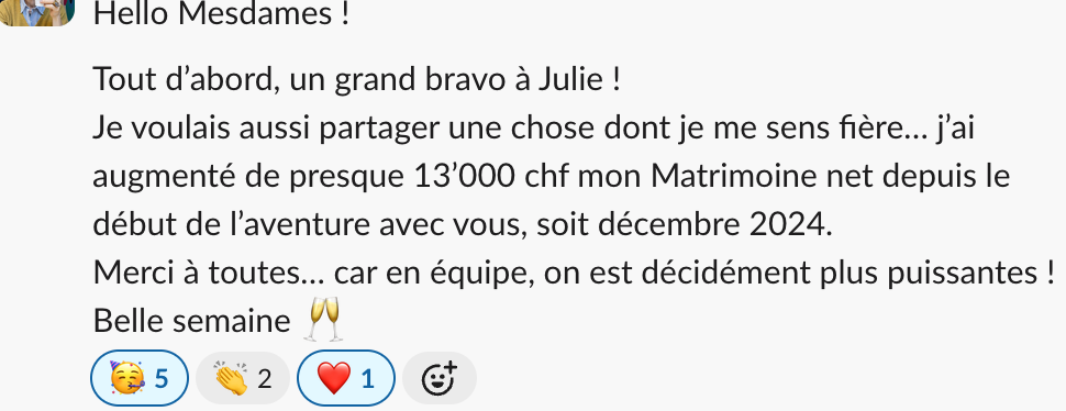 "Merci Francesca pour la qualité de tes interventions et la qualité des supports que tu mets à notre disposition. Avant ce programme j'épargnais déjà, mais à présent j'épargne de manière structurée avec une stratégie d'investissement. Si je devais retenir une phrase : il n'y a pas besoin d'avoir une grosse somme pour commencer à investir."